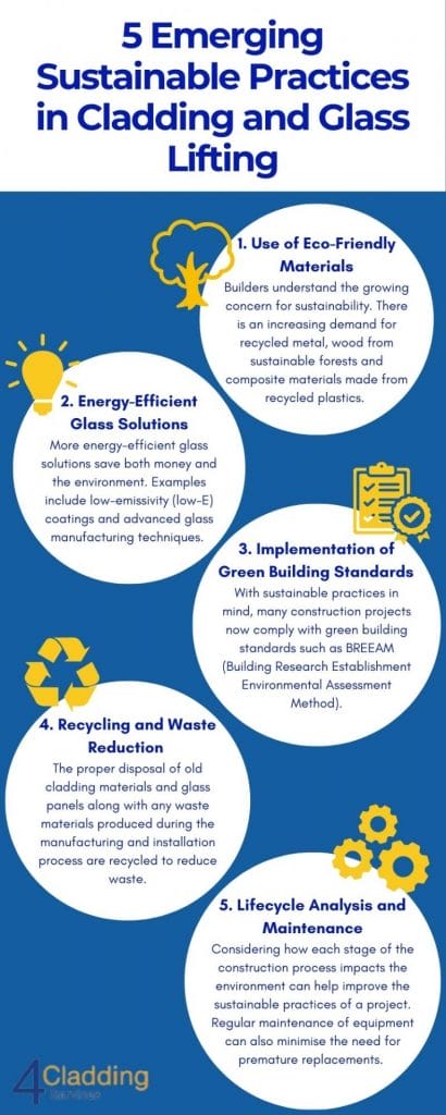 There has been a growing emphasis on sustainability within the construction industry in recent years, and the cladding and glass lifting sectors are no exception. Sustainable practices in these areas focus on minimising environmental impact, reducing energy consumption, and promoting long-term durability. Let’s take a closer look at some of the sustainable practices being adopted: